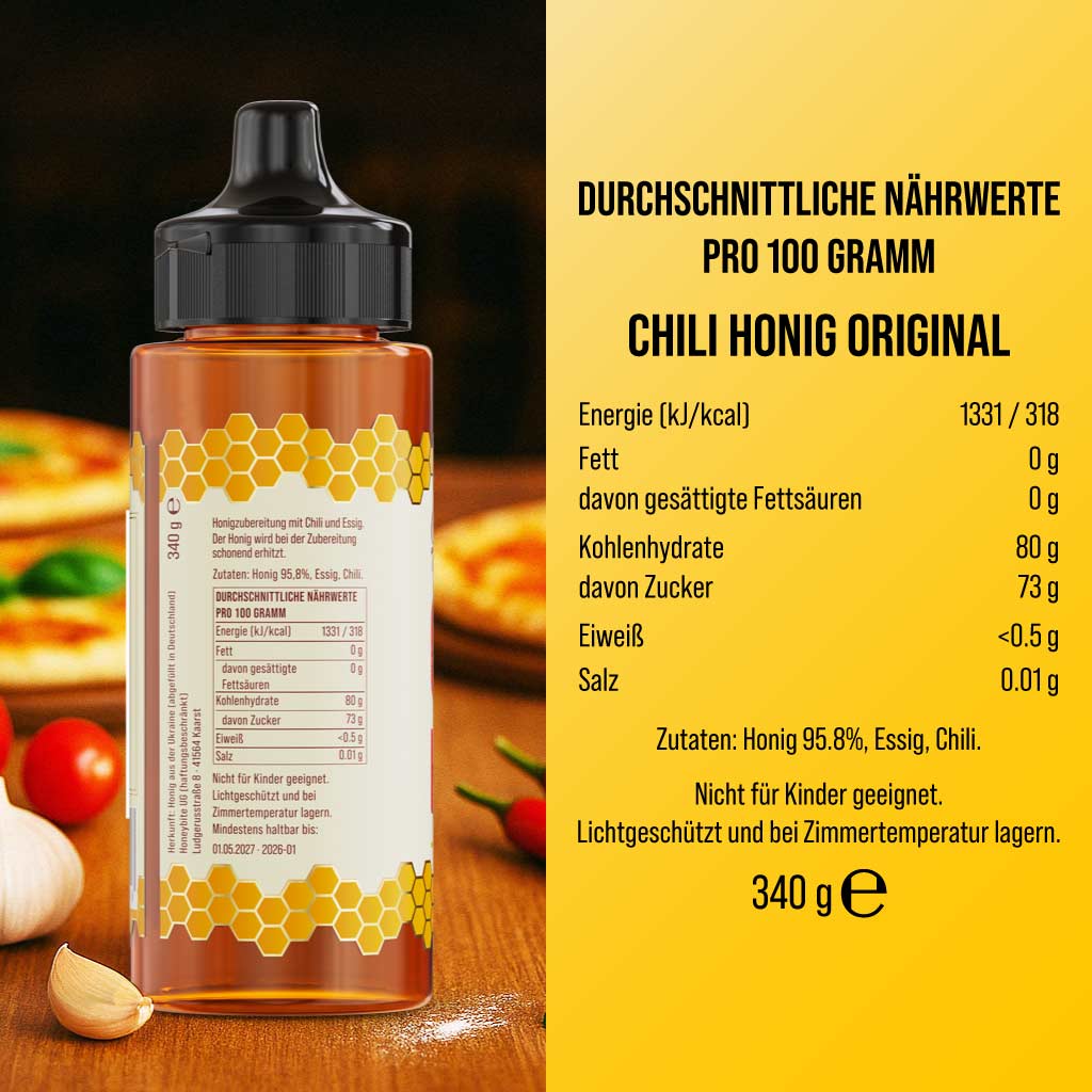 Unser einzigartiges Rezept wurde über Monate perfektioniert und ideal auf den deutschen und europäischen Gaumen angepasst. Deshalb setzen wir bei unserem Hot Honey auch ausschließlich auf europäischen Honig von höchster Qualität – laborgeprüft! Nur so können wir sicherstellen, dass unser Honig immer unseren Qualitätsansprüchen genügt. Billiger Honig aus außereuropäischen Ländern kommt für uns nicht in Frage, auch wenn wir so massiv Kosten bei der Herstellung sparen könnten. Qualität geht vor!